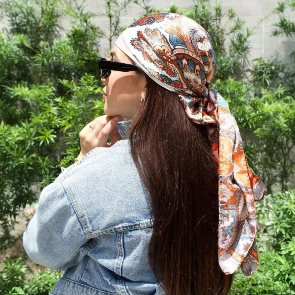Lenço quadrado grande de cetim de seda 90×90 | Acessório Feminino Retro Elegante p/ Cabelo, Pescoço, Bolsa e Presente