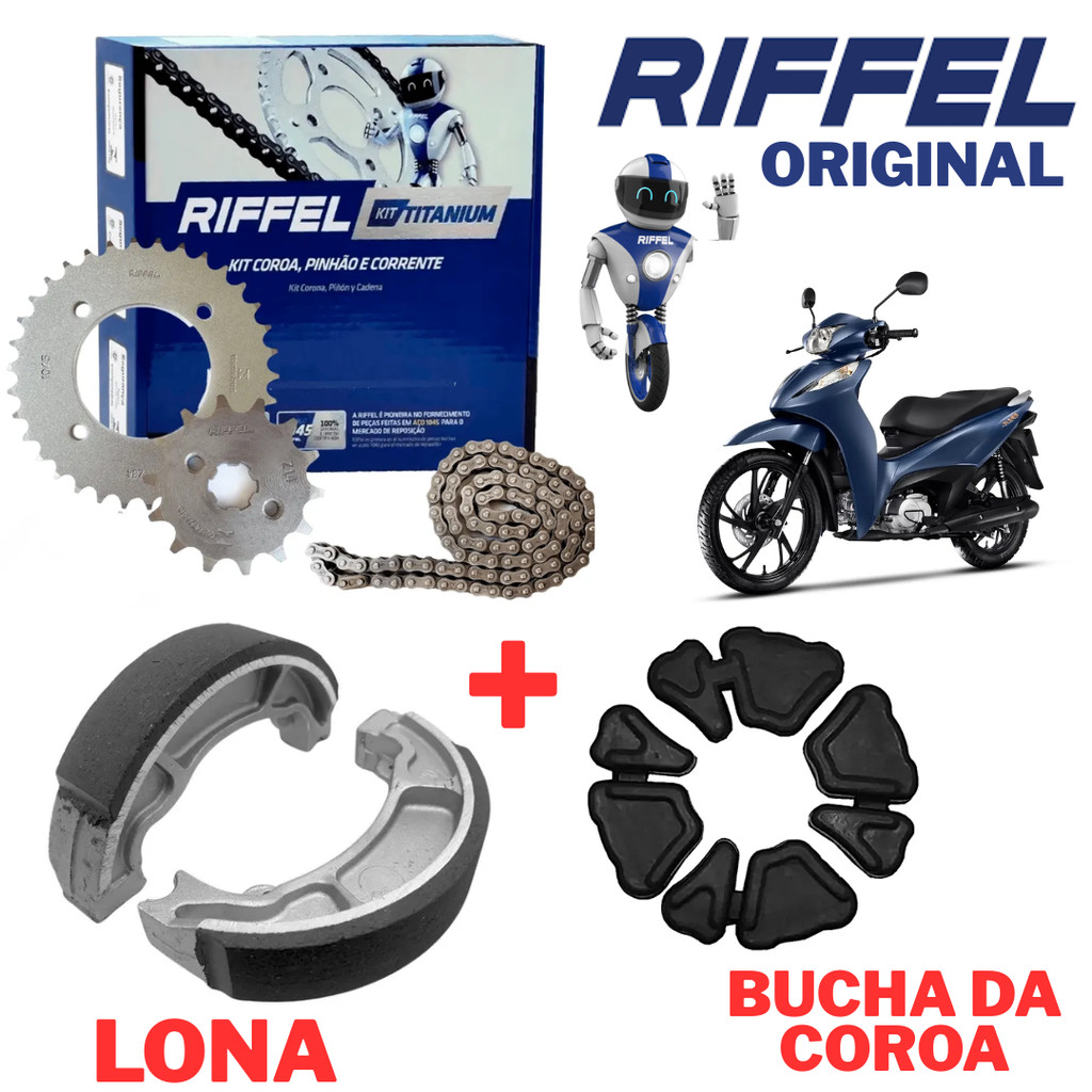 KIT RELAÇÃO TRANSMISSÃO BIZ 125 ORIGINAL RIFFEL + LONA + COXIM em Oferta na Shopee Shopee