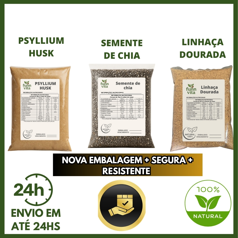 KIT FIBRAS PSYLLIUM HUSK, SEMENTE DE CHIA E LINHAÇA DOURADA PRODUTO NATURAL