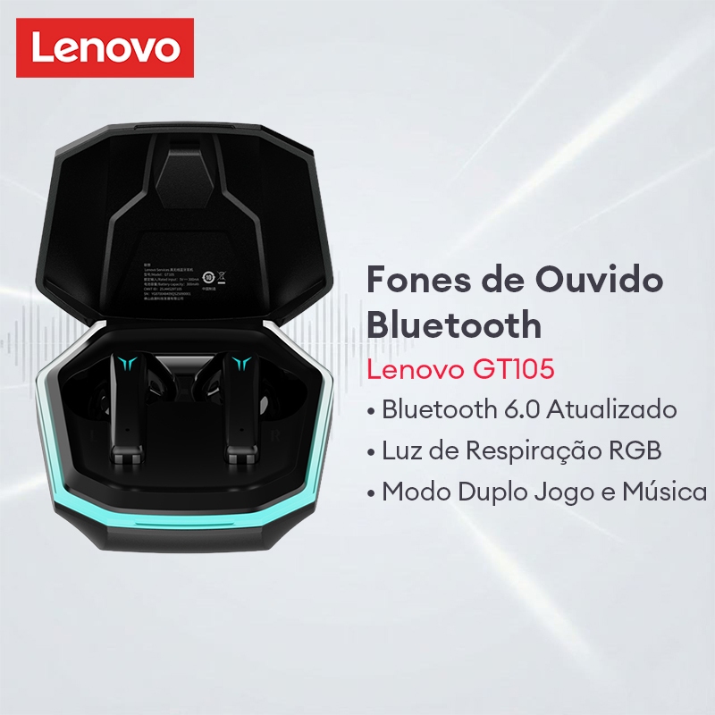 Fone de Ouvido Sem Fio Lenovo GT105 Bluetooth 6.0 Gamer Luz RGB Efeito Mamba Unidade 13mm Som HiFi Profissional