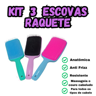 Kit 3 Escovas De Cabelo Raquete Curvada Anti Frizz