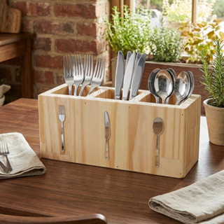 Porta Talheres Organizador de Talher de Madeira Pinus Com Divisórias para Cozinha