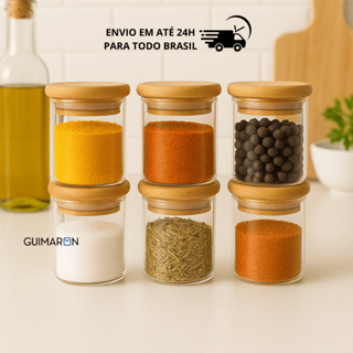 Kit 6 Potes de Vidro 200ml com Tampa de Bambu Hermético Mantimentos Condimentos Empilhaveis