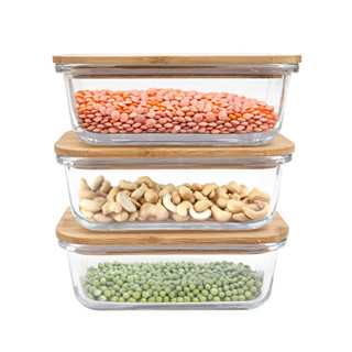 kit 3 potes de vidro 600ml com tampa de bambu hermético marmita retangulares - Tud