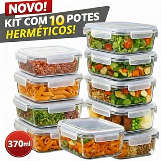 Kit 10 Potes Marmita Fit 400ML Retangular Com Tampa 4 Travas Jogo de Potes Livres de BPA
