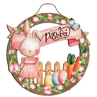 Placa Decorativa em MDF Guirlanda Adesivada - Pascoa - Coelhinha Rosa