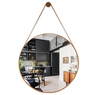 Espelho Decorativo Redondo Adnet com Alça de Couro Retrô para Banheiro Quarto e Sala
