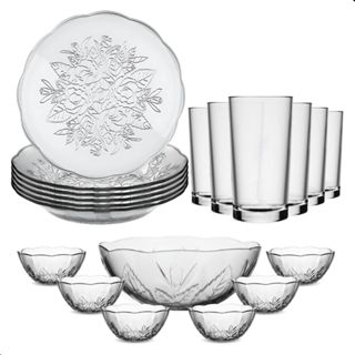 Aparelho de Jantar 19 Peças em Vidro Floral – Pratos, Copos, Tigelas e Saladeira