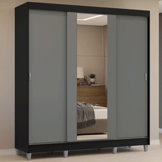 Guarda-Roupa Casal com Pés 3 Portas de Correr com Espelho Preto/Cinza Reno Madesa