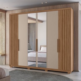 Guarda-roupa Casal Mdf com Espelho 3 Portas 6 Gavetas Miami Ripado Cinamomo/Off White