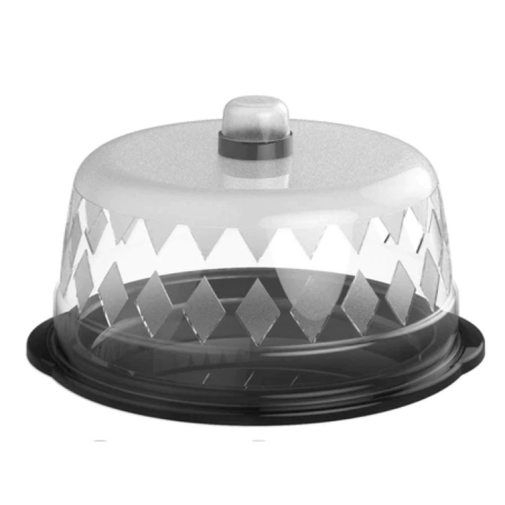 Queijeira Plástica Redonda com Prato e Tampa Decorada Translúcida e Base Preta – Protege e Conserva