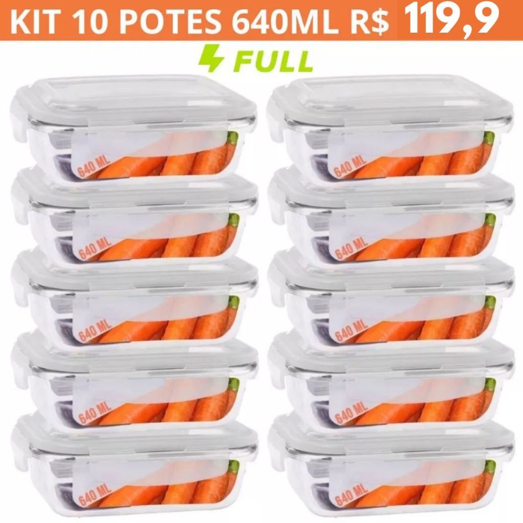 Kit 10 Potes de Vidro Hermético Retangular 640ml Marmita Microondas Freezer Forno