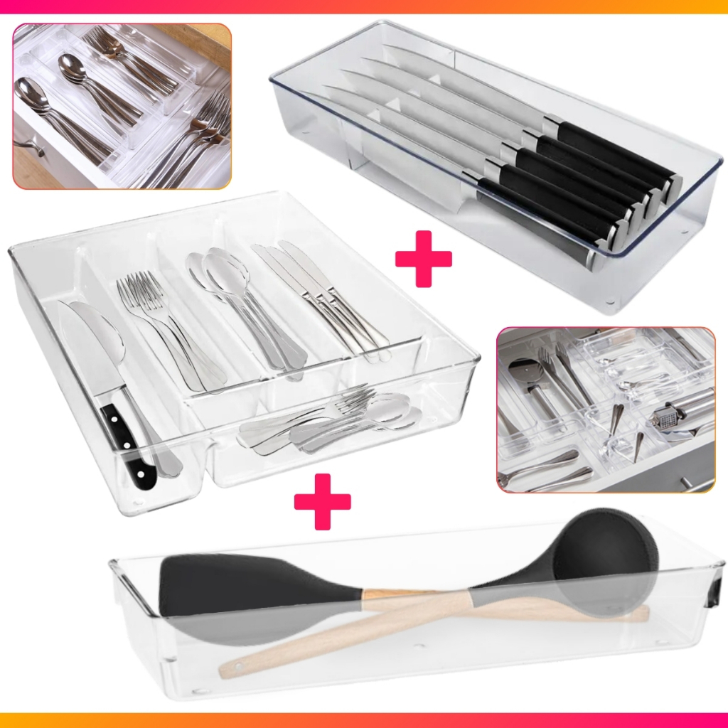 Kit Organizador de Talher 5 Divisórias + Porta Facas Para Gaveta + Organizador Utensílios Grandes