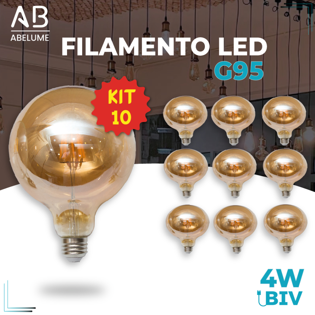 Kit 10 Lâmpada Filamento LED G95 4W E27 LUZ QUENTE (AMARELO) Âmbar Retrô Vintage 110V~220V | Bivolt