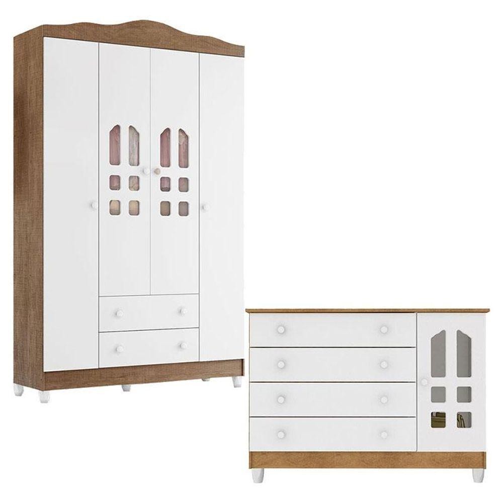 Cômoda Gran Selena E Guarda Roupa Infantil New Selena 4 Portas Branco Acetinado Amadeirado