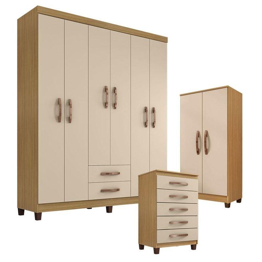 Guarda Roupa Casal Com Cômoda Cannes 5 Gavetas E Armário Multiuso Carvalho Off White Incorplac