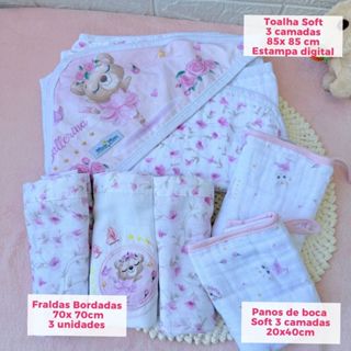 Toalha de banho bebe soft 3 camadas + 3 fralda bordadas + panos de boca soft com alça de chupeta