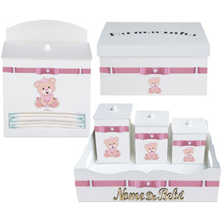 Kit de Higiene para bebê Menina em MDF Branco com Fitas de Cetim rosa Personalizado