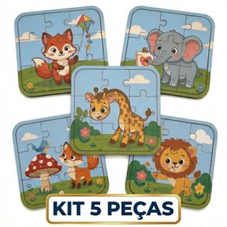 Kit 5 Quebra-Cabeça Infantil Educativo Madeira Mdf Animais Selva Fofos Brinquedo Pedagógico Desenvolvimento 9 Peças cada