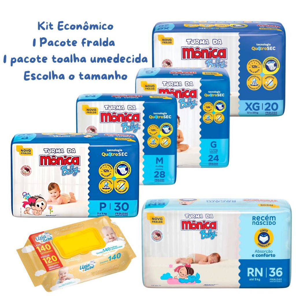 Kit Fralda Descartável Turma da Mônica Baby + Toalhas Umedecidas Upa Bebê – Cuidado do Bebê