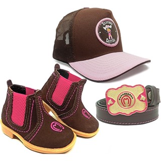 Kit Infantil Feminino Botina Mangalarga + Bone Kids Brutinha Caipira + Cinto C/ Fivela Mm Rosa CV