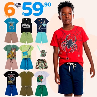 Kit Sortido 6 Peças de Roupas Infantil Menino 3 Camisetas + 3 Bermudas - Kit com 3 Conjuntos de Roupa Infantil Menino