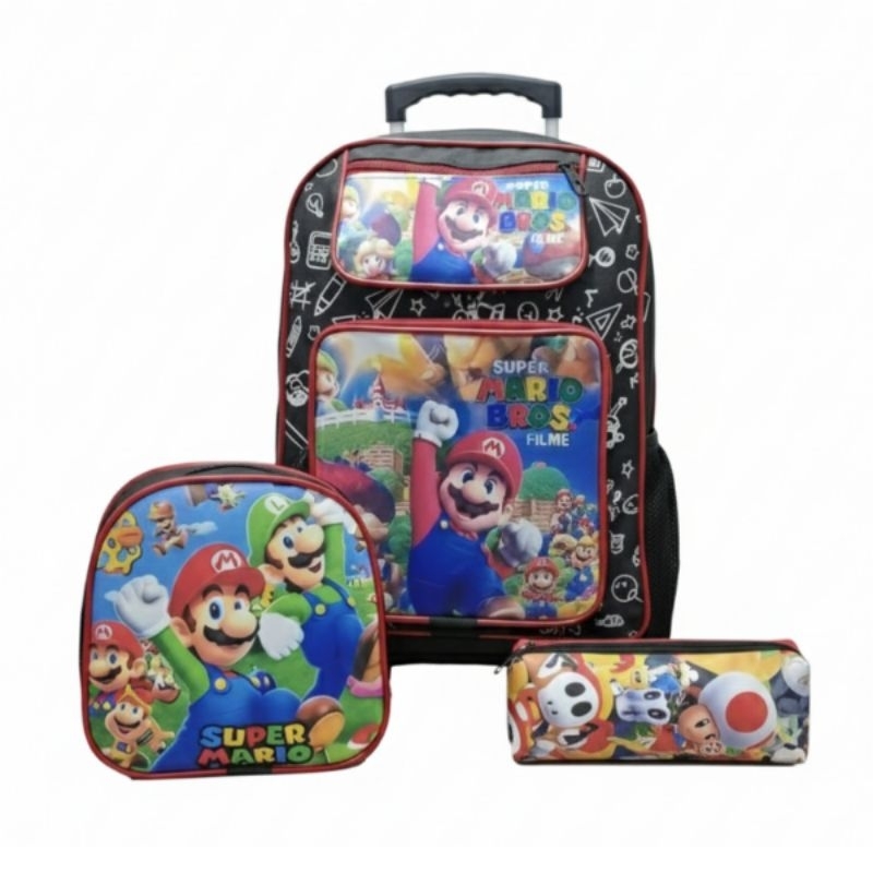 Kit Escolar infantil Mochila com rodinhas, lancheira e estojo Super Mario