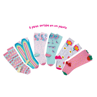 Kit 06 Pares Meia 3/4 Infantil Menina Até o Joelho Galochita Colorida 22 ao 33