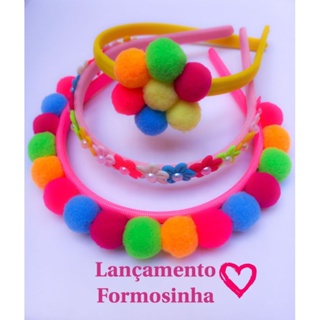 kit 3 Lindas Tiaras Coloridas Com Florzinhas Meia Pérolas e Pompons Acessório de Cabelo Infantil Arquinho