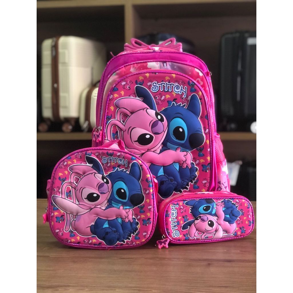 Mochila Rodinha Costas Stitch Angel Lancheira e Estojo Mochila Infantil PROMOÇÂO