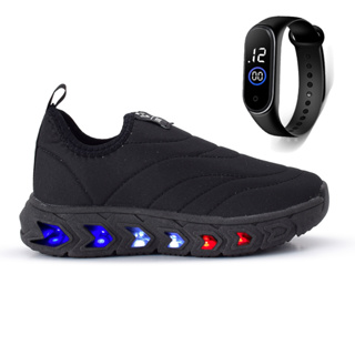 Tenis Infantil de Led Menino e Menina Calce Facil Preto + Relogio