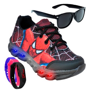 Kit Tenis Masculino Infantil De Led Meninos Homem Aranha + Óculos e Relógio Barato Macio Confortável