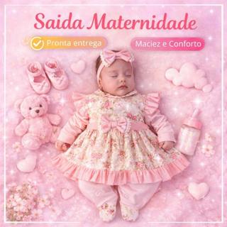 Saída Maternidade Menina Luxo 5 Peças Floral RN 100% Algodão – Macacão Vestido Faixa Manta e Luvas