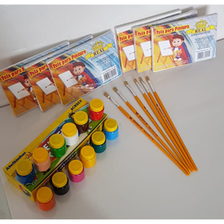 Kit Pintura = 15 Telas Para Pintura 10x15cm + 15 Pincéis + 12 Tintas Guache