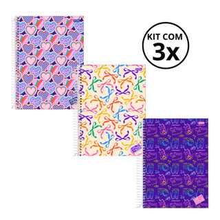 Kit 03 Cadernos Universitário 10 Matérias 160 Folhas Stella - Jandaia CAPA:Coração/Laço/Gato