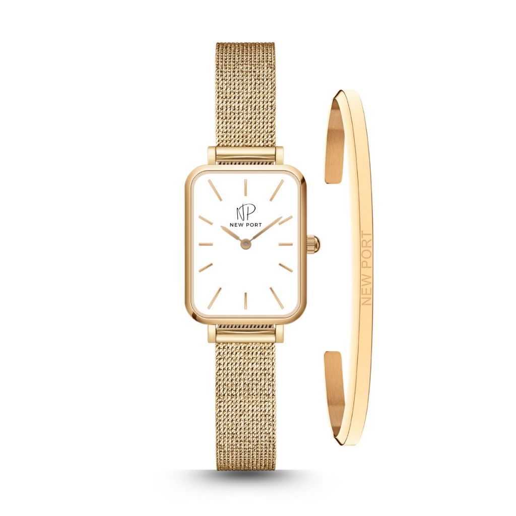 Relógio Feminino Quadrado Dourado Casual Elegante + Bracelete New Port