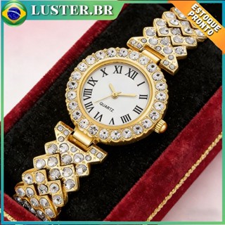 Relógio de pulso feminino de ouro com incrustações de diamantes, relógio de quartzo com numeração romana, leve e luxuoso