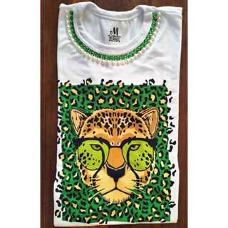 Tshirt feminina estilosa luxo com pedrarias na gola onça verde blusinha