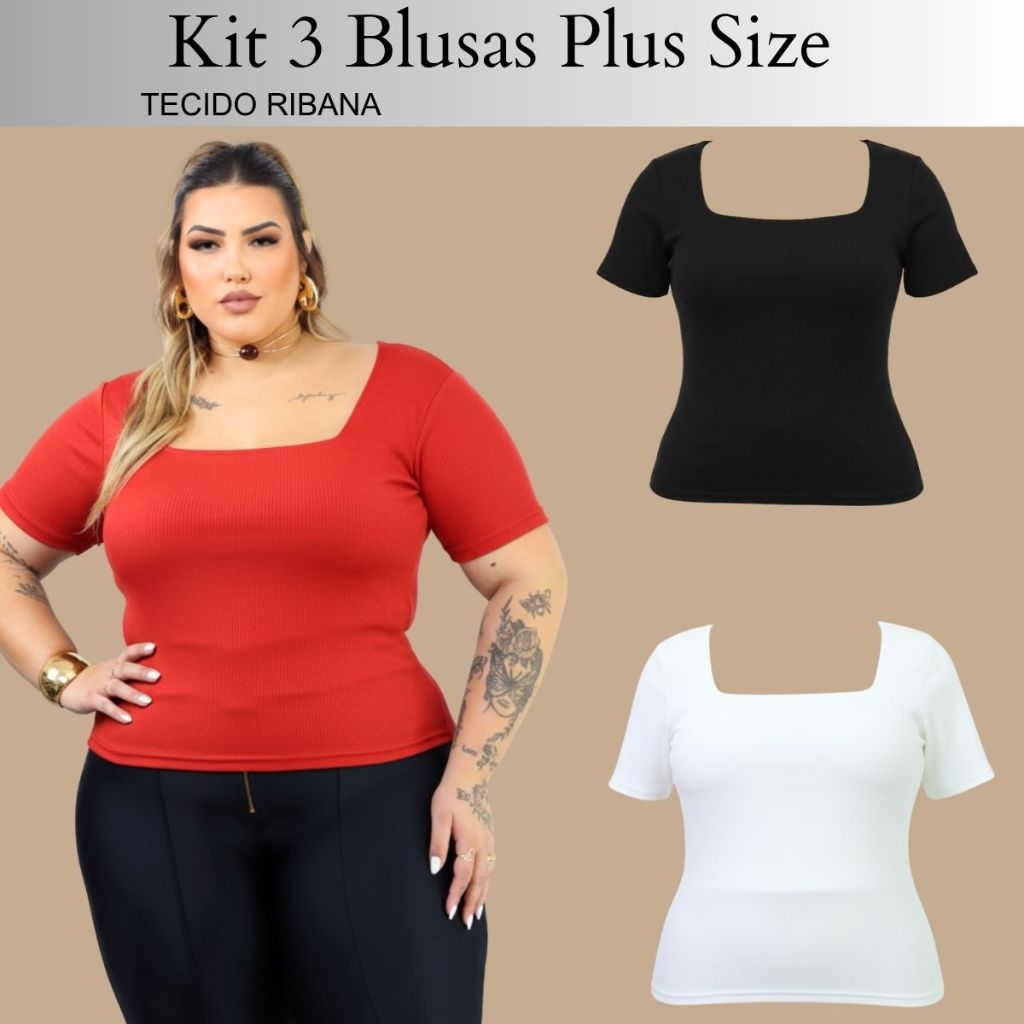 Kit 3 Blusas Plus Size Gola Quadrada Feminina Verão Basica casual elegante ALTA ELASTICIDADADE curve