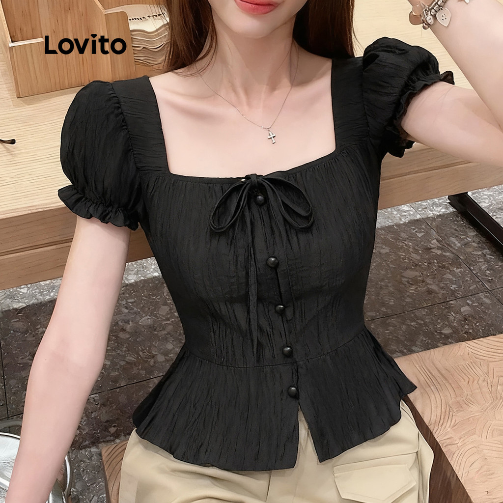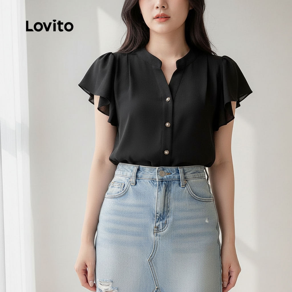 Lovito Blusa Casual Feminina Lisa Botões Babados Verão Primavera L129AD1030