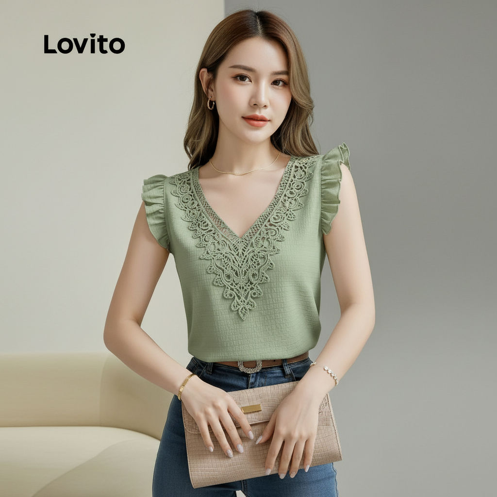 Lovito Blusa Feminina Verde com Babados no Decote para Primavera Verão
