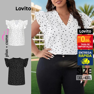 Lovito Blusa Plus Size Manga Curta com Babados Estampa Poa Feminina LBL07115
