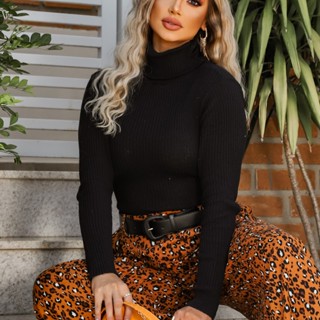 Blusa Cacharrel Gola Alta Canelada Tricot Manga Longa Segunda Pele