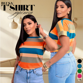 Blusa Femenina T-shirt Listrada, lisa Manga Curta Doblada Tendencia 2026 Viscolycra Premium Cores Verao Imverno