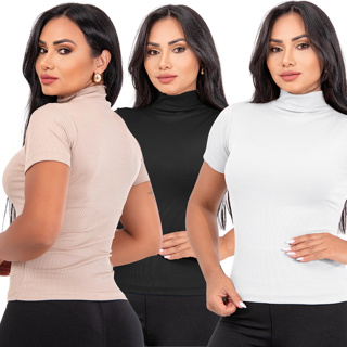 Kit 3 Blusas Feminina Manga Curta Gola Alta Canelada Moda Blogueira T-Shirt na Ribana