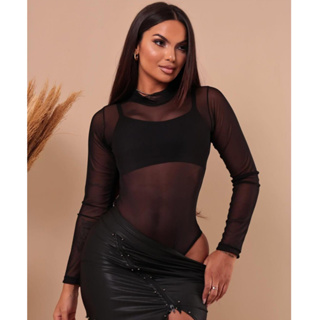 Body Manga Longa - Transparente - Cacharrel Liso Preto Gola Alta Sexy