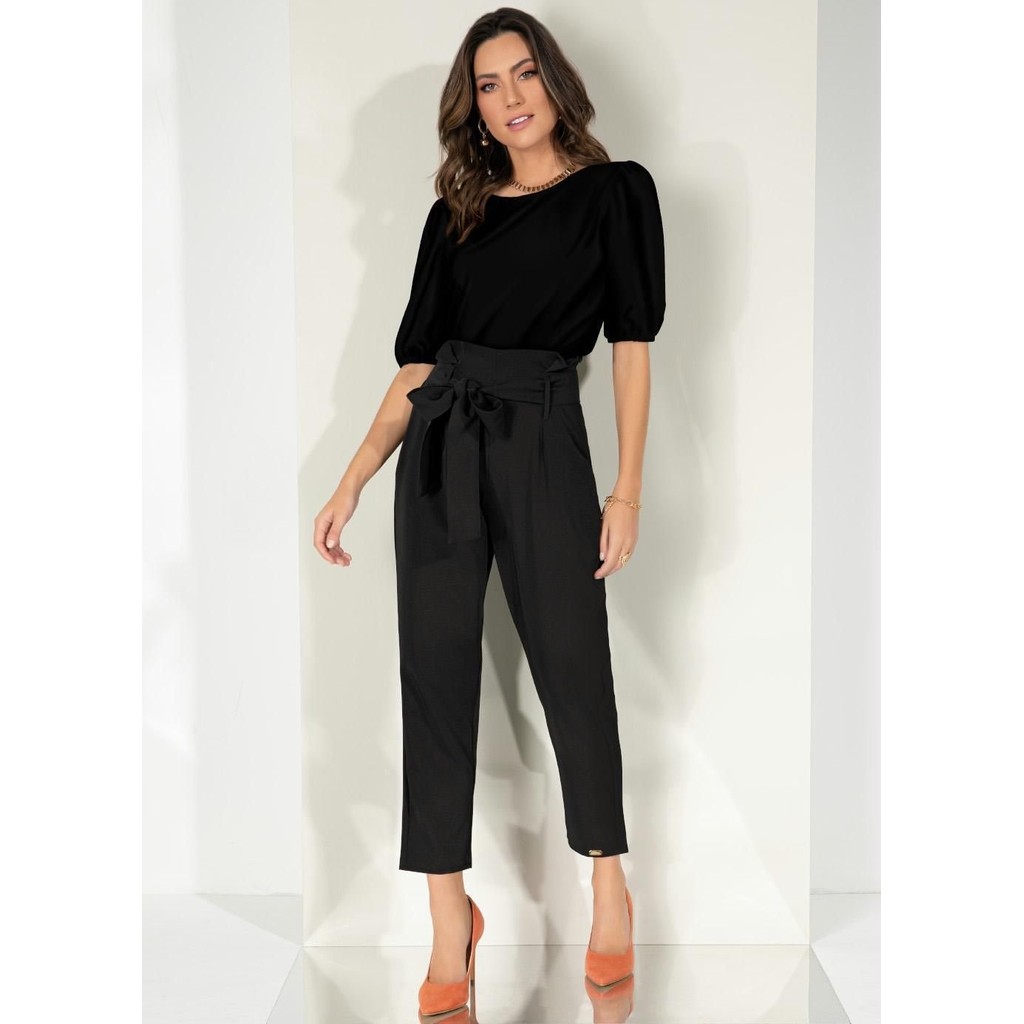 Blusa Decote Canoa Com Mangas Bufantes Preto Quintess