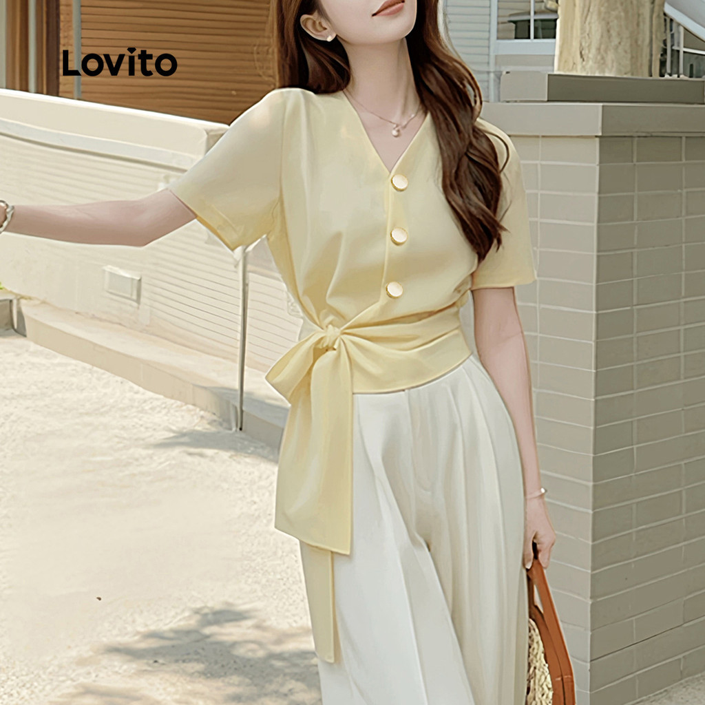 (Trendy) Lovito Blusa Casual Com Cadarço E Botão De Laço Blusa De Verão/Primavera Para Mulheres L129AD1033