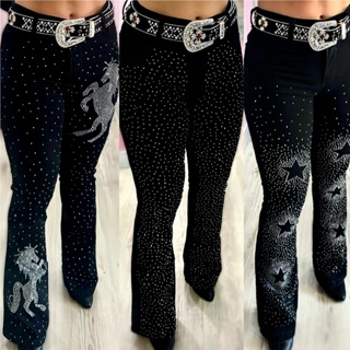 Calça Flare Jeans Feminina Country Rodeio de Luxo Cintura Alta com Strass