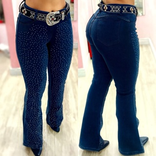 Calça Country Flare Jeans Feminina Pedrarias Escura Cintura Alta Modela Bumbum Brilhos Rodeio